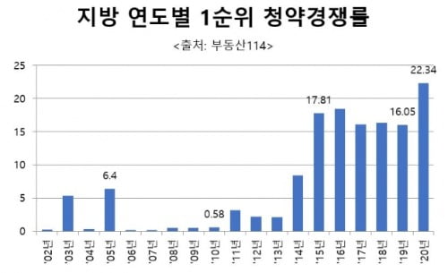 23일 리얼하우스에 따르면 지방(수도권 제외, 5대광역시 포함)의 올해(1월~4월 13일) 1순위 평균 청약경쟁률은 22.34대 1로 나타났다. 이는 금융결제원이 인터넷 청약을 받기 시작한 2002년 이후 최고 경쟁률이다.