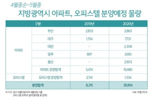 부동산시장 분석업체 부동산인포에 따르면 총선이 끝난 4월 중순부터 5월사이 지방5개 광역시에서 아파트가 1만9480가구가 공급된다. 지난해 같은기간보다 2배 이상 늘어난 수준이다. 대구가 7700여가구로 가장 많고 광주가 3600여가구, 울산이 2900여가구 등의 순이다.